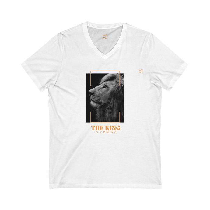 V-Neck Tee, 100% cotton, Lion Graphic "The King is Coming" on front, Daniel 7:14 on back, Inspirational T-shirt