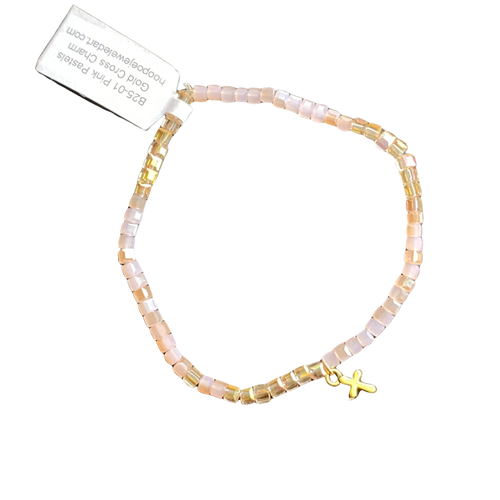 Pink Pastel Glass Cubes with Gold Mini-Cross, Stretch Bracelet, Petite Bracelet
