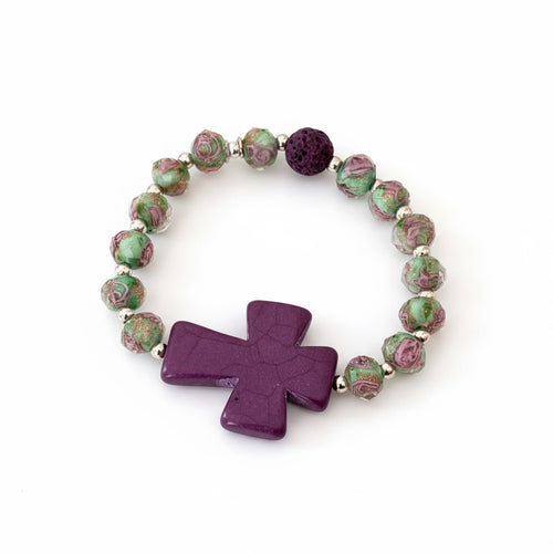 Essential Oil Bracelet, Bold Purple Cross Focal, Glass Beads in Green with Purple Roses
