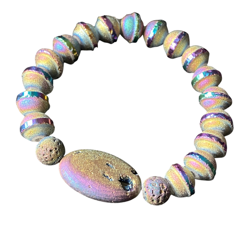 Essential Oil Bracelet, Blue UFO-shaped Iridescent Glass Beads, Iridescent Oval Focal, Iridescent Lava Stones