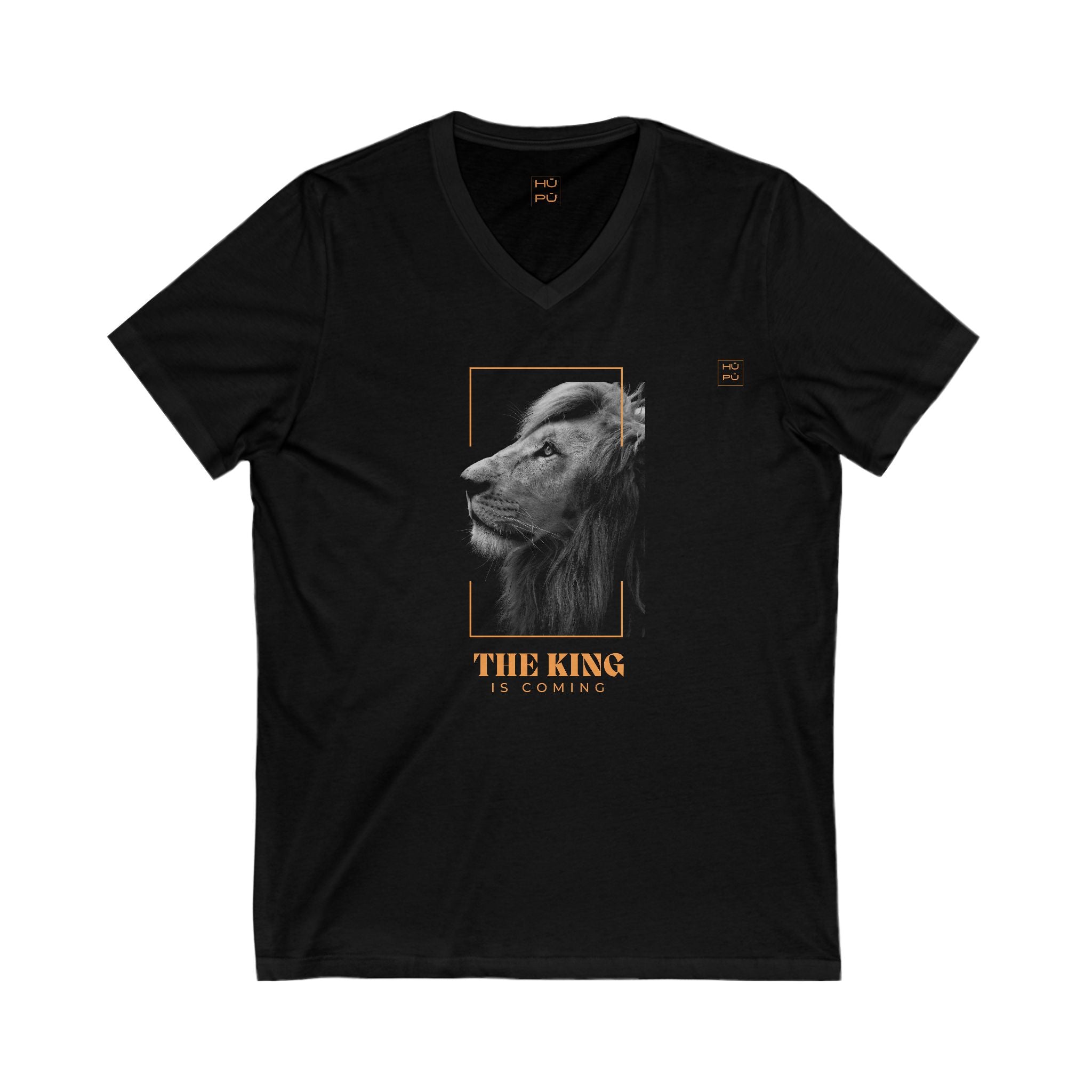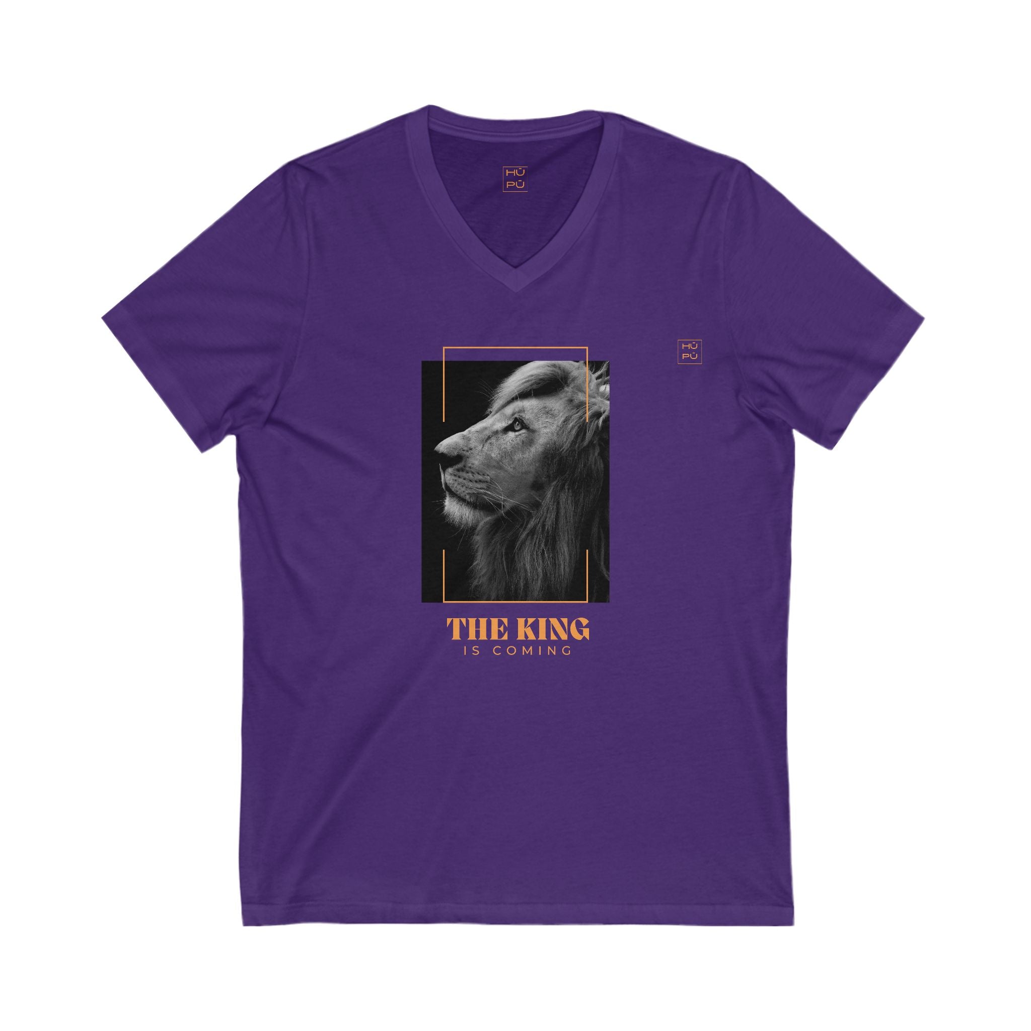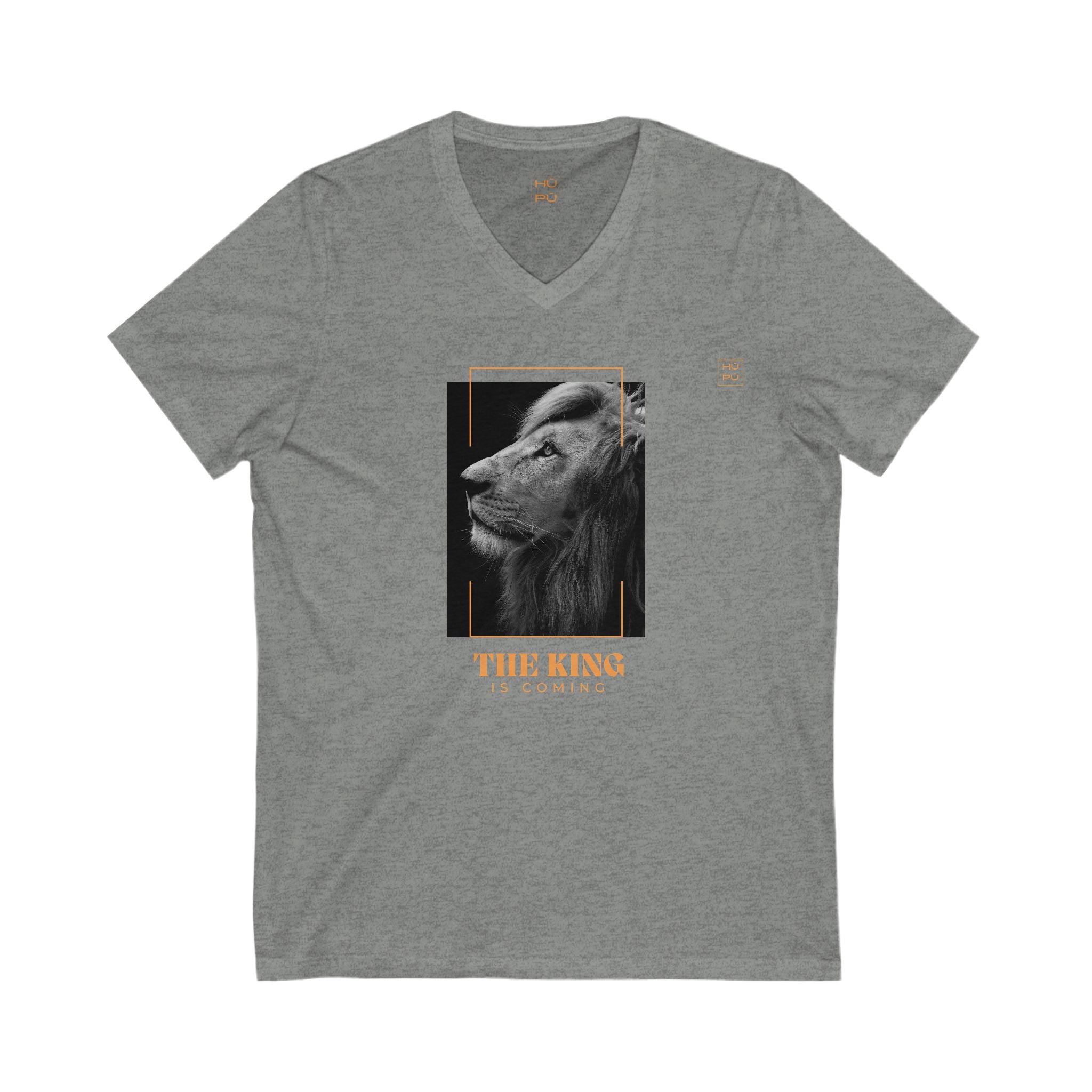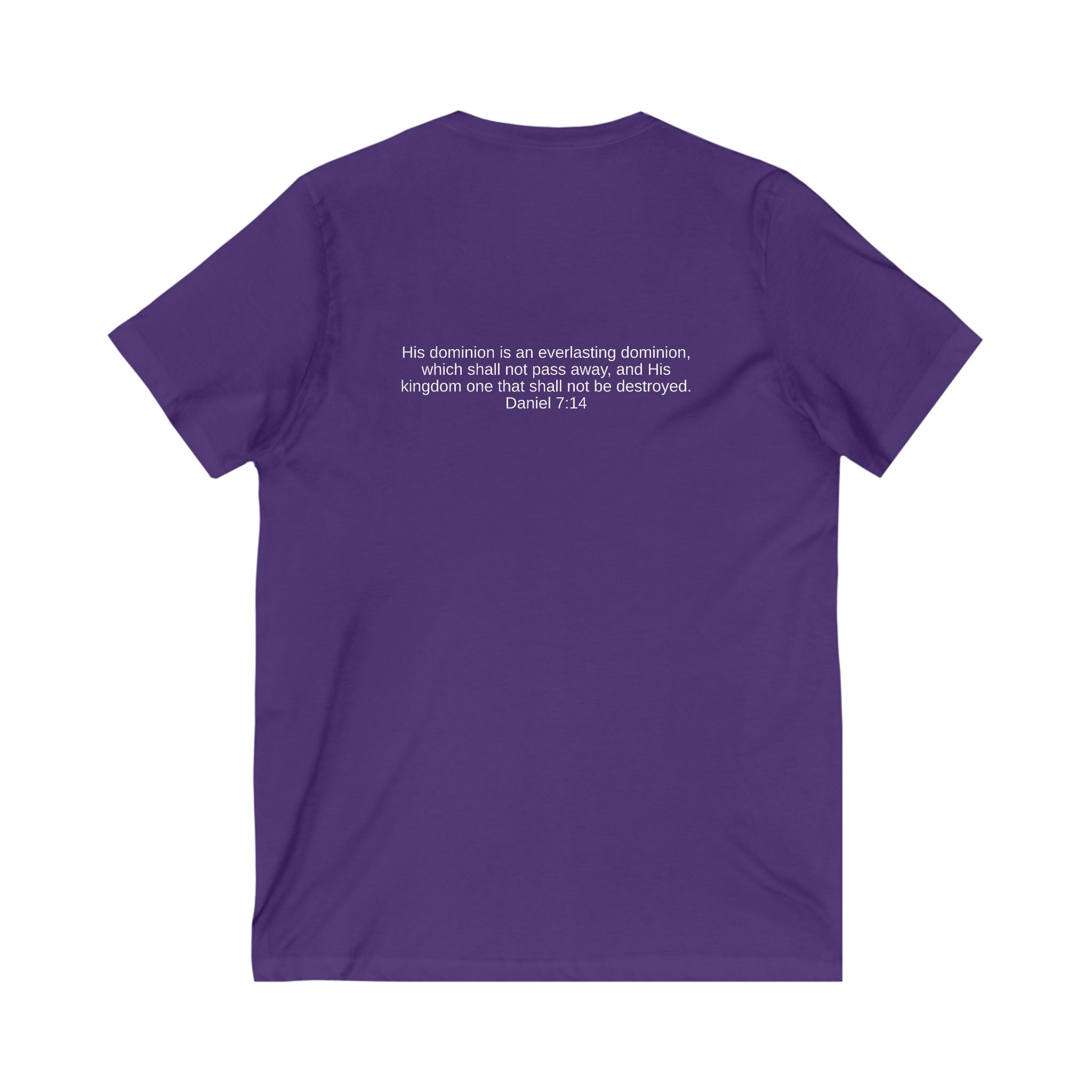 Show off your faith and fierce spirit with this fun V-Neck Tee! A majestic lion on the front boldly declares "The King is Coming," while the back features the bible verse Daniel 7:14, reminding everyone that His reign lasts forever. Made from 100% soft, high-quality fabric, this tee blends comfort and style perfectly—great for brightening up your everyday look with a hopeful, powerful Christian message.