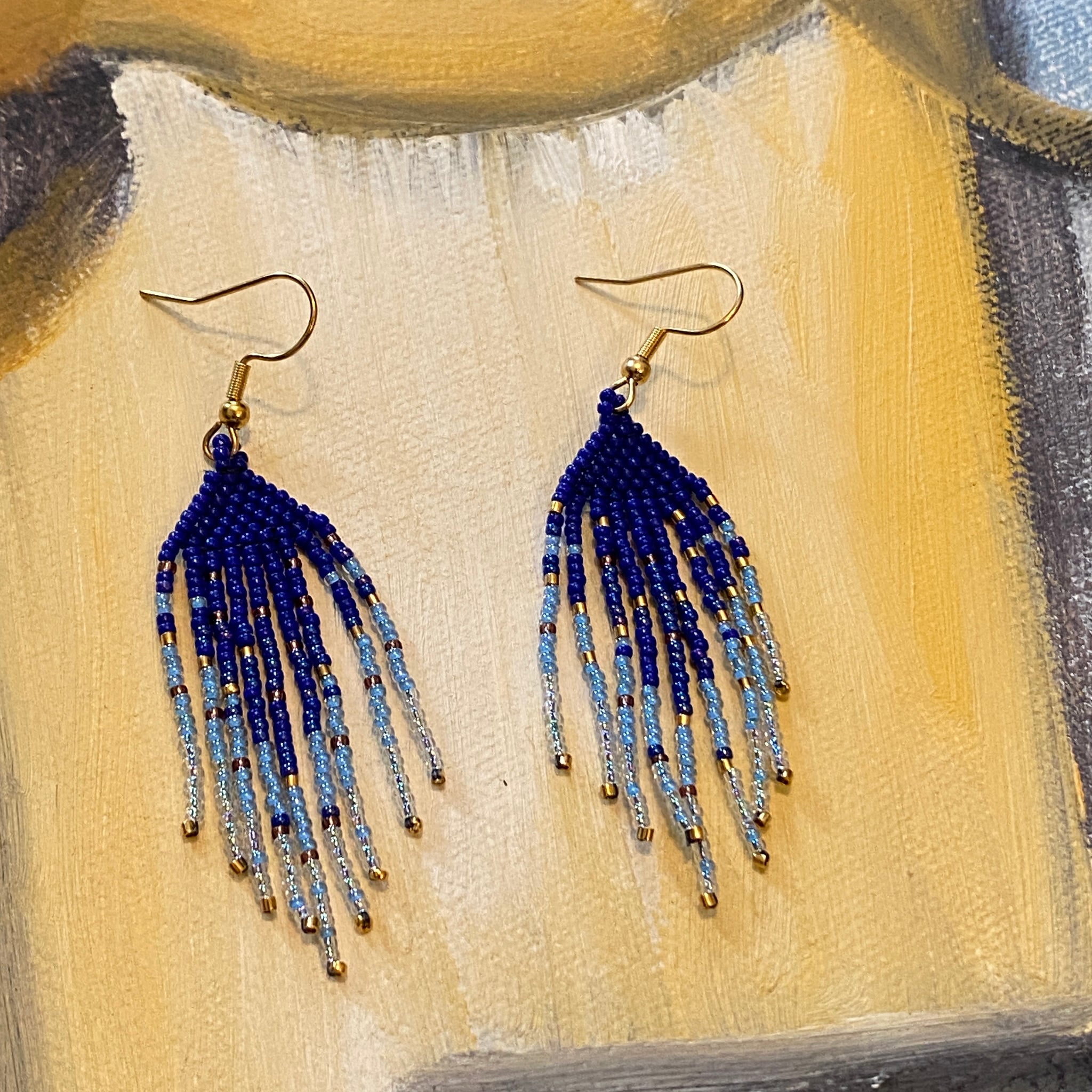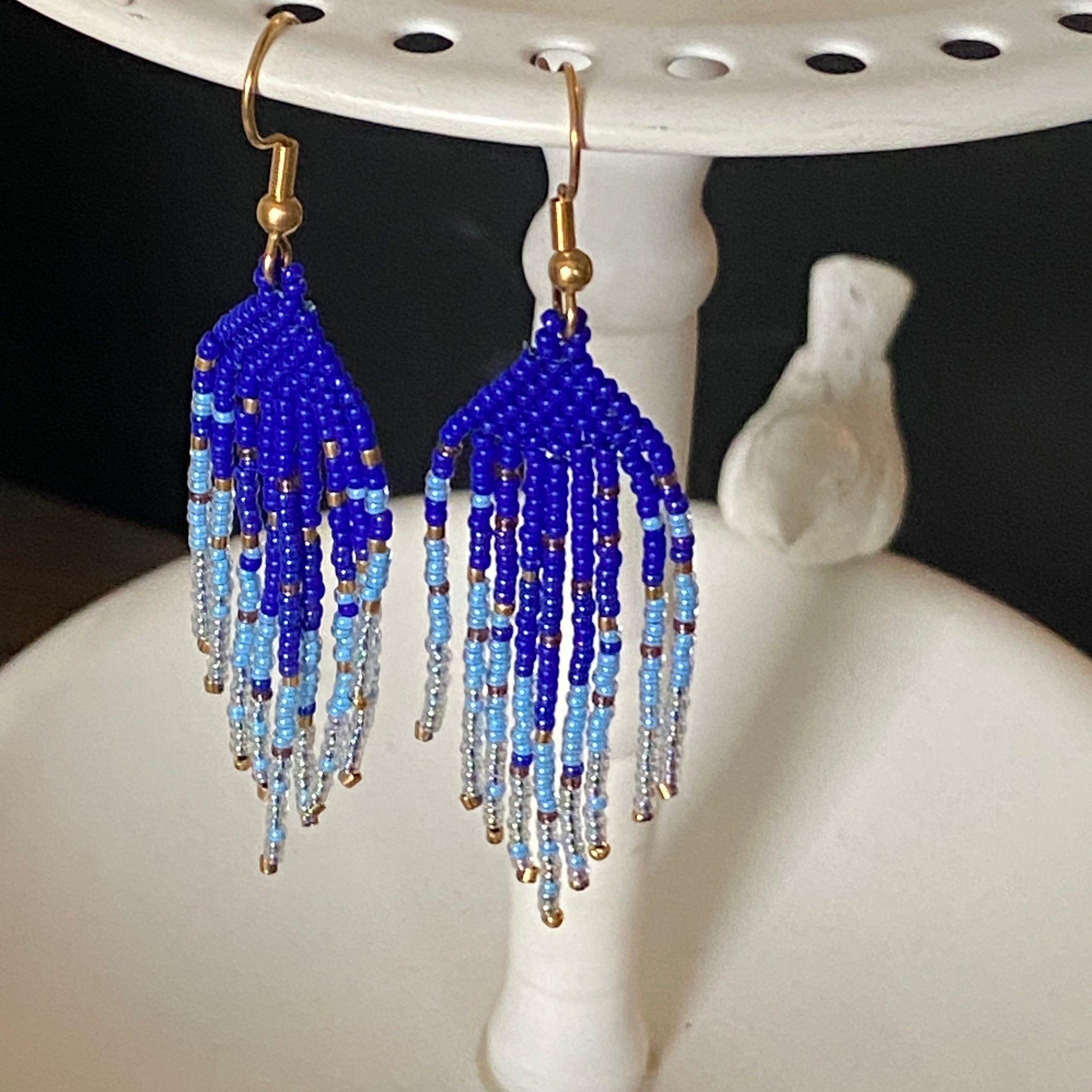 Elegant fringe earrings featuring a sophisticated combination of cobalt and light blue beads accented by lustrous 14K gold beads. Each earring cascades 2¾ inches, creating graceful movement with every wear. Crafted with hypoallergenic stainless steel ear wires finished in gold for a polished, cohesive look. Perfect for adding refined dimension to both everyday and special occasion ensembles.