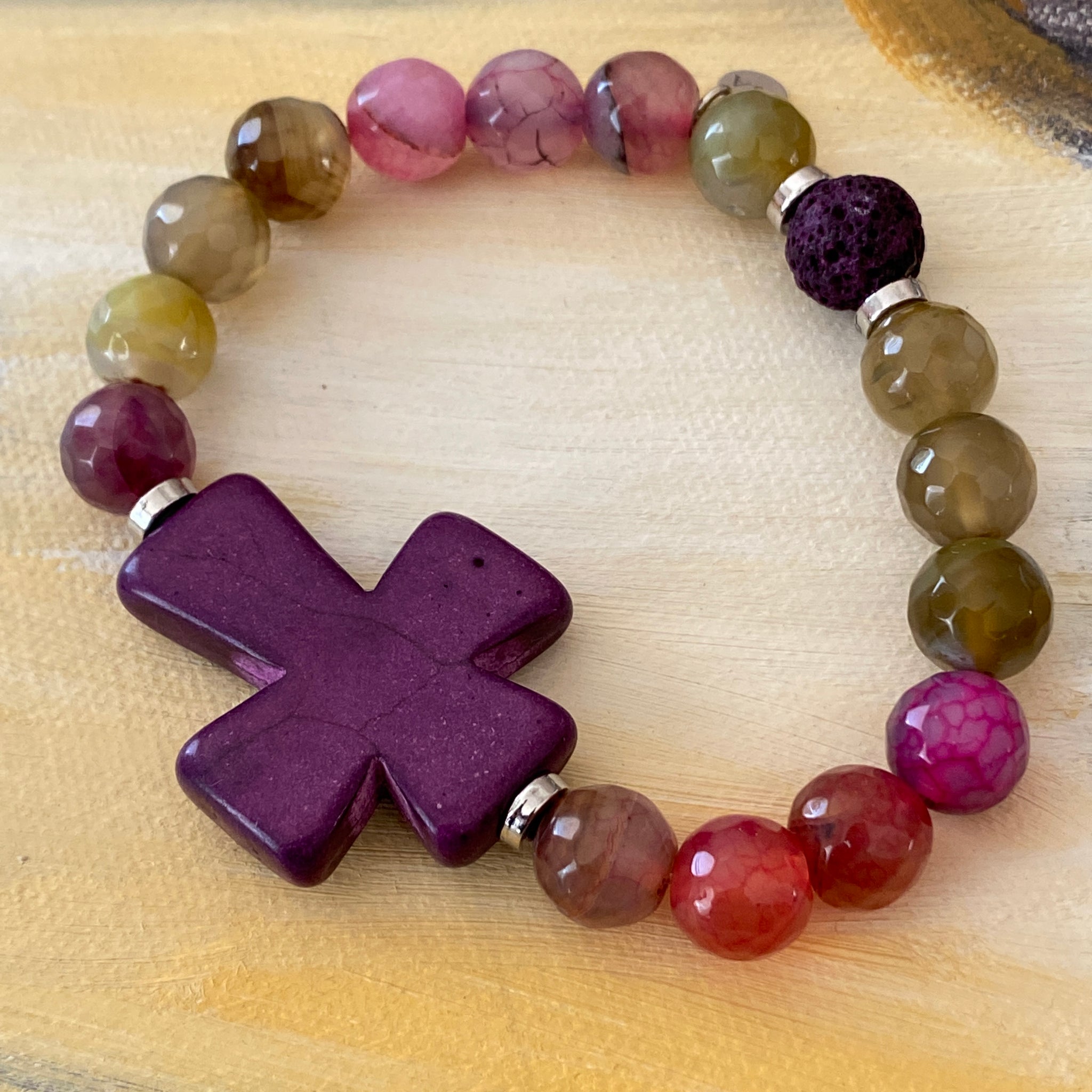 Wear your faith and wellness on your wrist! This stunning bracelet features a large purple cross focal bead that commands attention, beautifully framed by a cascade of natural agates from soft pink to rich green. Each stone is thoughtfully selected to create a harmonious blend of colors that catches the light with every movement. Perfect for essential oil diffusing or simply as a gorgeous statement piece, this bracelet combines spiritual intention with eye-catching style.