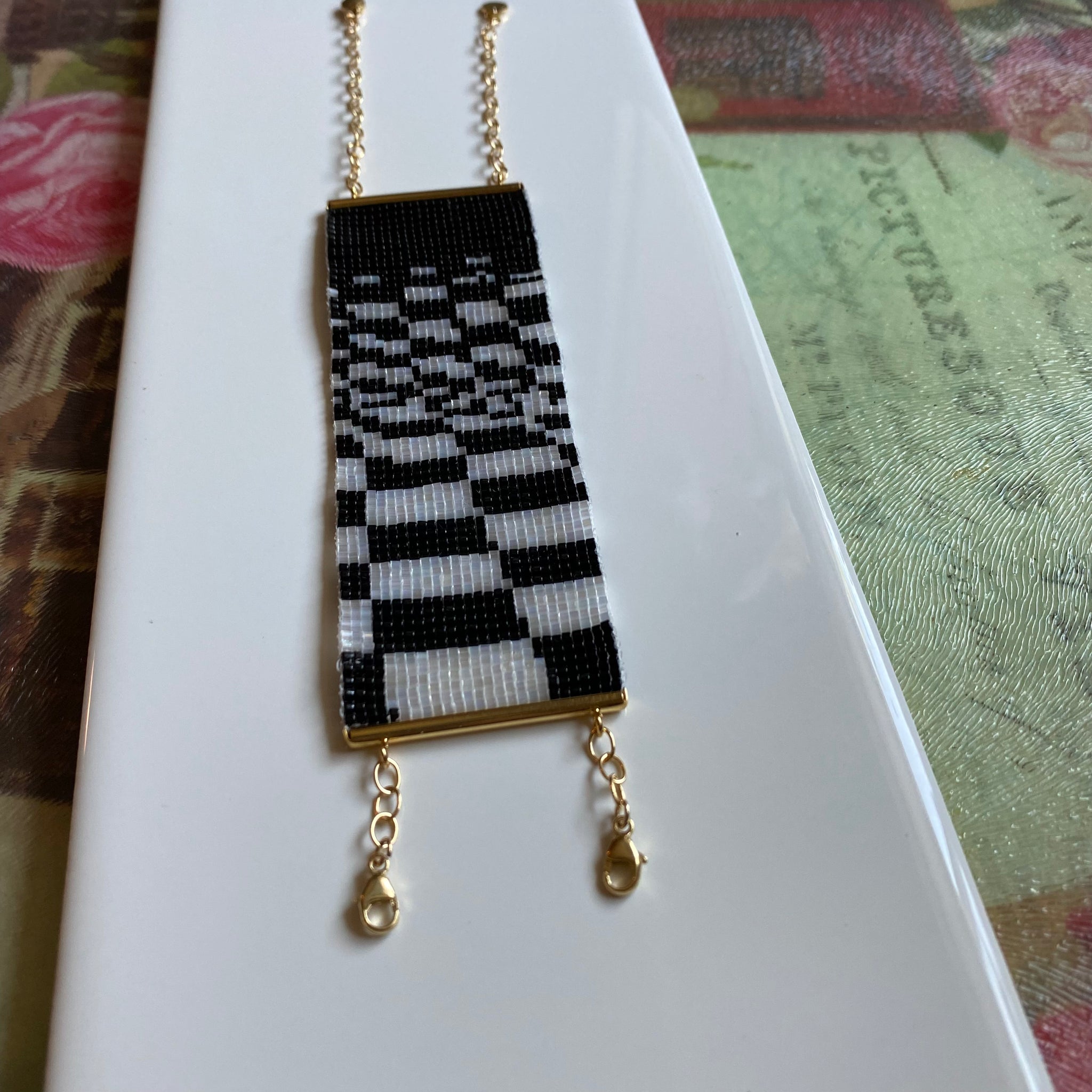 Handwoven Bracelet "Anamorphic" shimmers with the finest glass beads in classic black and white. Inspired by the famous distorted hallway of the Casa Ceramica showroom in Manchester, England, Anamorphic replicates in beads the wave illusion of a warped checkerboard pattern and the distortion utilized by anamorphic lenses in iconic films such as Star Wars, Mad Max:Fury Road and Blade Runner.