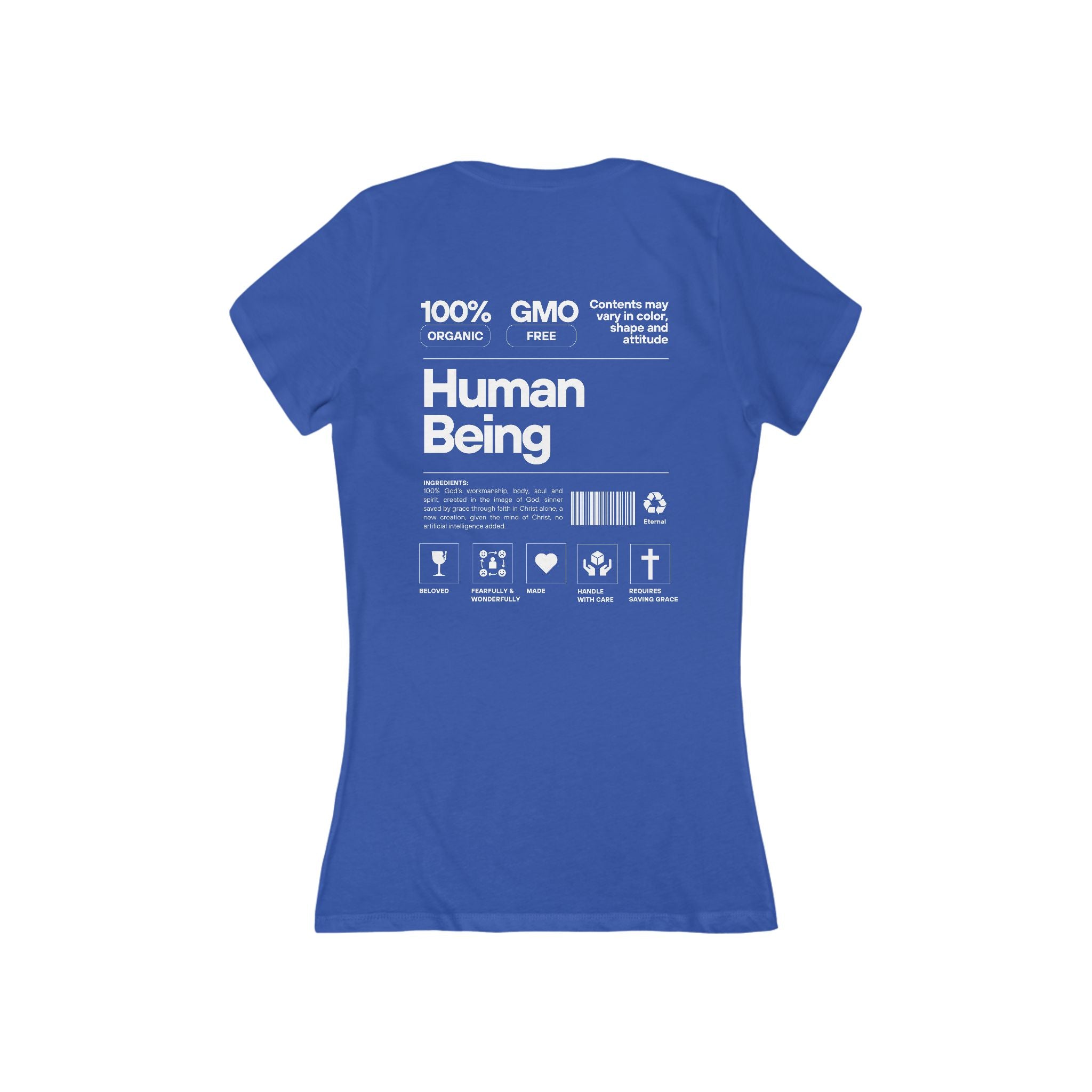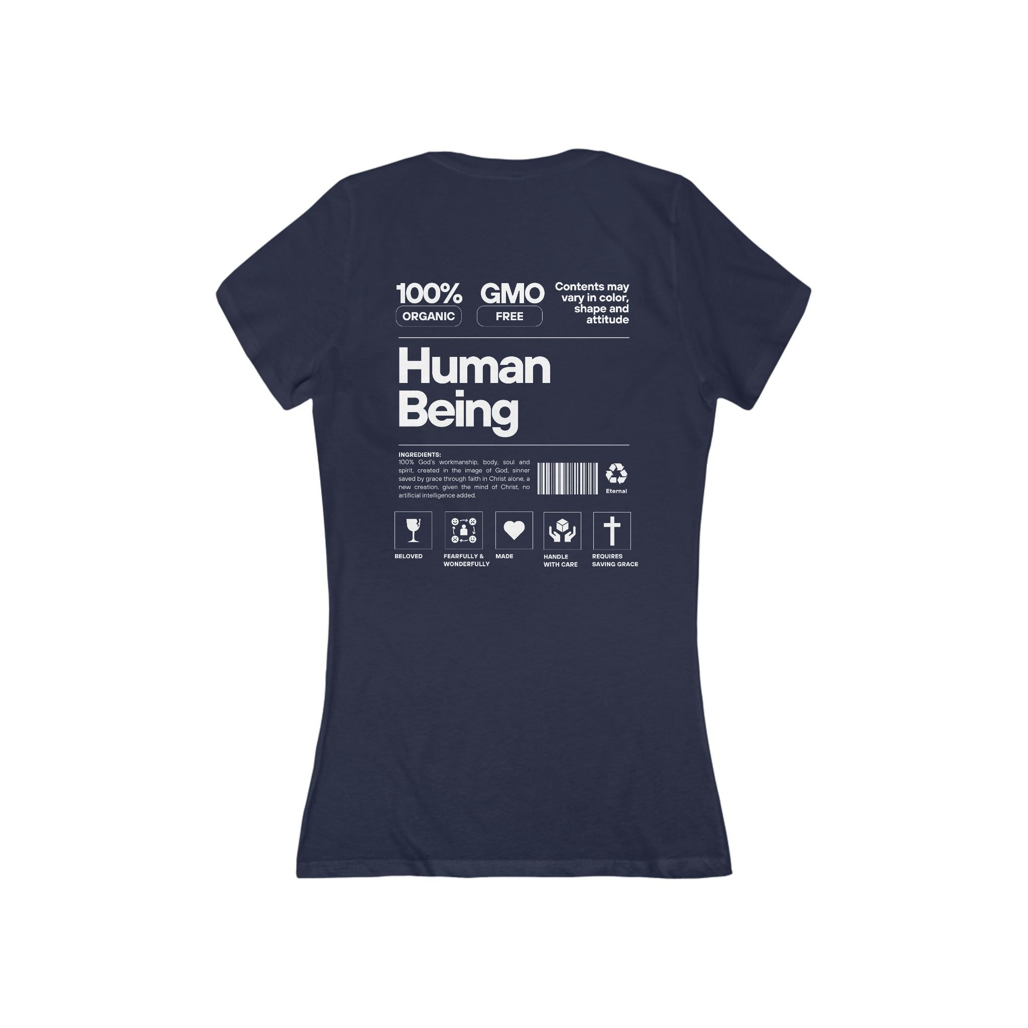 You'll love our latest inspirational t-shirt design featuring a graphical play on ingredient labels - this one for Being 100% Human, made in the image of God. An uplifting reminder we are fearfully and wonderfully made and beloved by God. Elevate your casual wardrobe with this comfortable deep V-Neck women's tee. Crafted for comfort and style, it embodies a relaxed vibe perfect for everyday wear, a quality staple in any wardrobe.