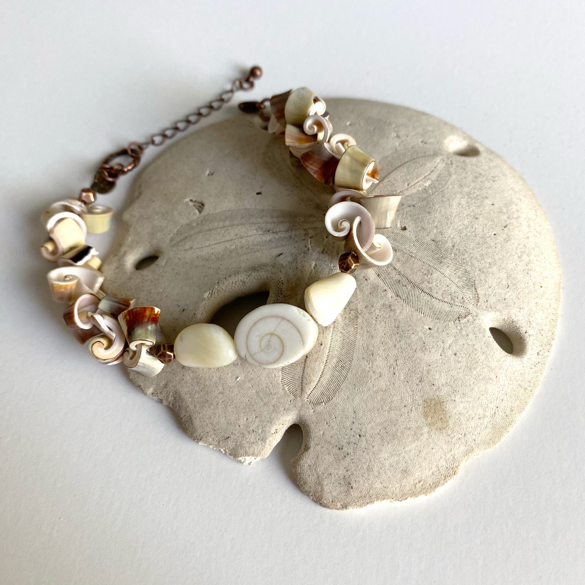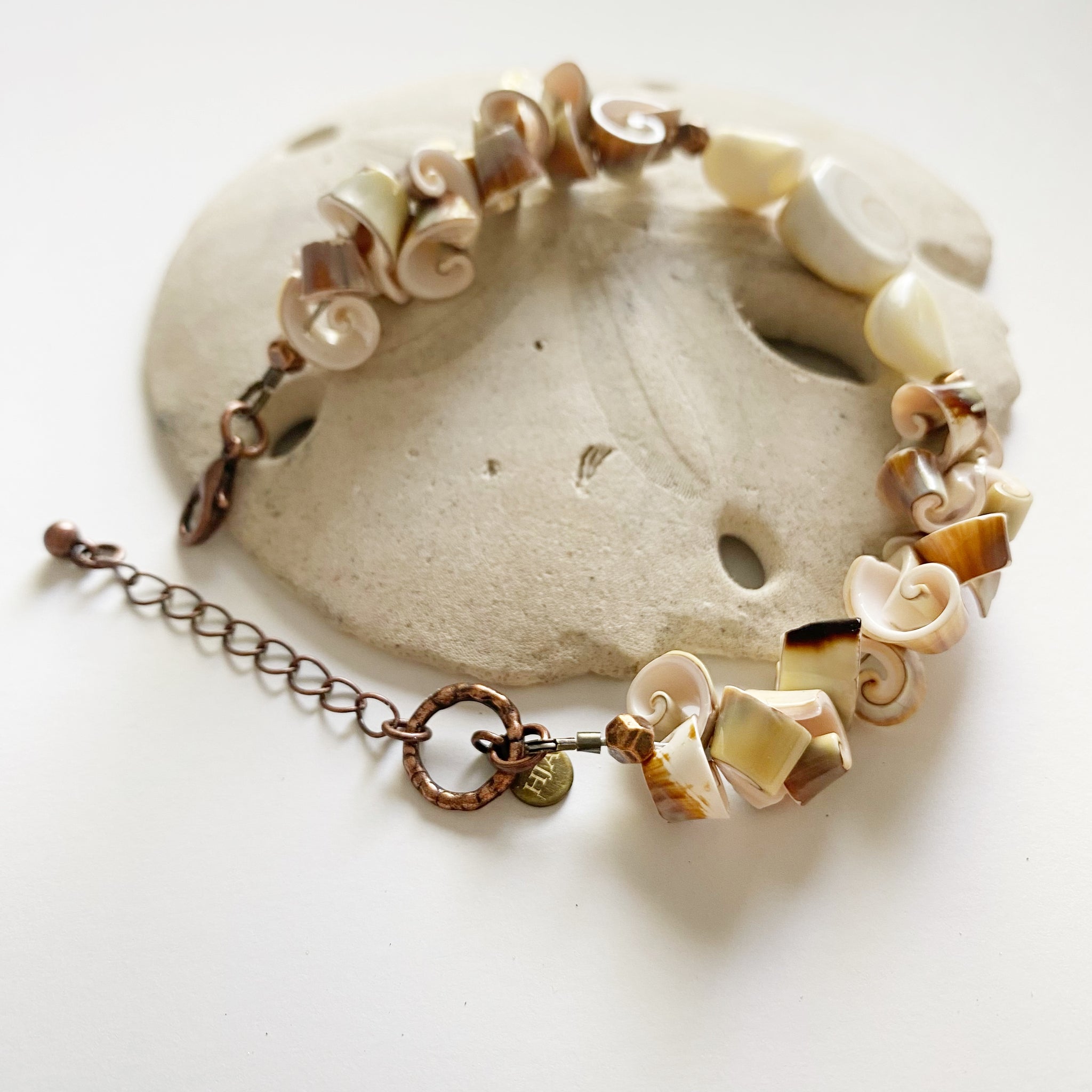 Swirls and Swells. Loving the way these shells swirl as if jumbled in the ocean's tide, hugging as they showcase the main focal of a polished spiral shell. Show off the spiral, or flip to show the polished rich brown of the shell. Brass accents and clasp set off the earthy tones of this adjustable length bracelet.